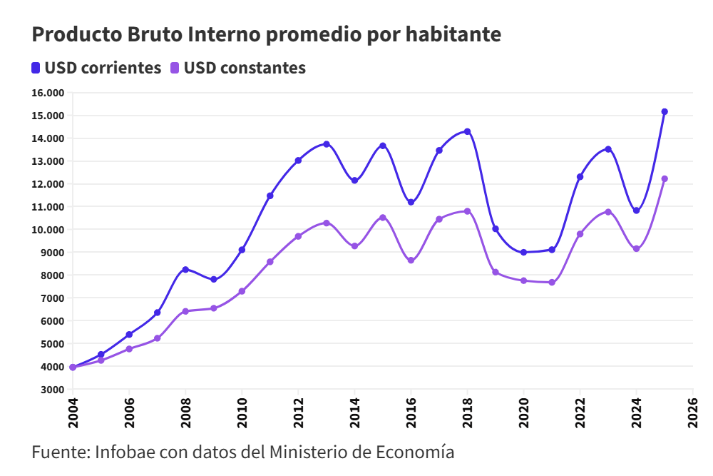 Tal y como señala el medio Infobae, el pib per cápita real alcanza su punto más alto desde 2004. Esta mejora de los ingresos per cápita de los argentinos les permite recuperar el consumo de carne de vacuno (que cayó con los fuertes ajustes iniciales del gobierno de Javier Milei), también les ha permitido que 2025 sea el mejor año desde 1995 para la compraventa de coches de segunda mano, o que cada vez se necesiten menos salarios para comprar un coche, como podemos ver en este gráfico.