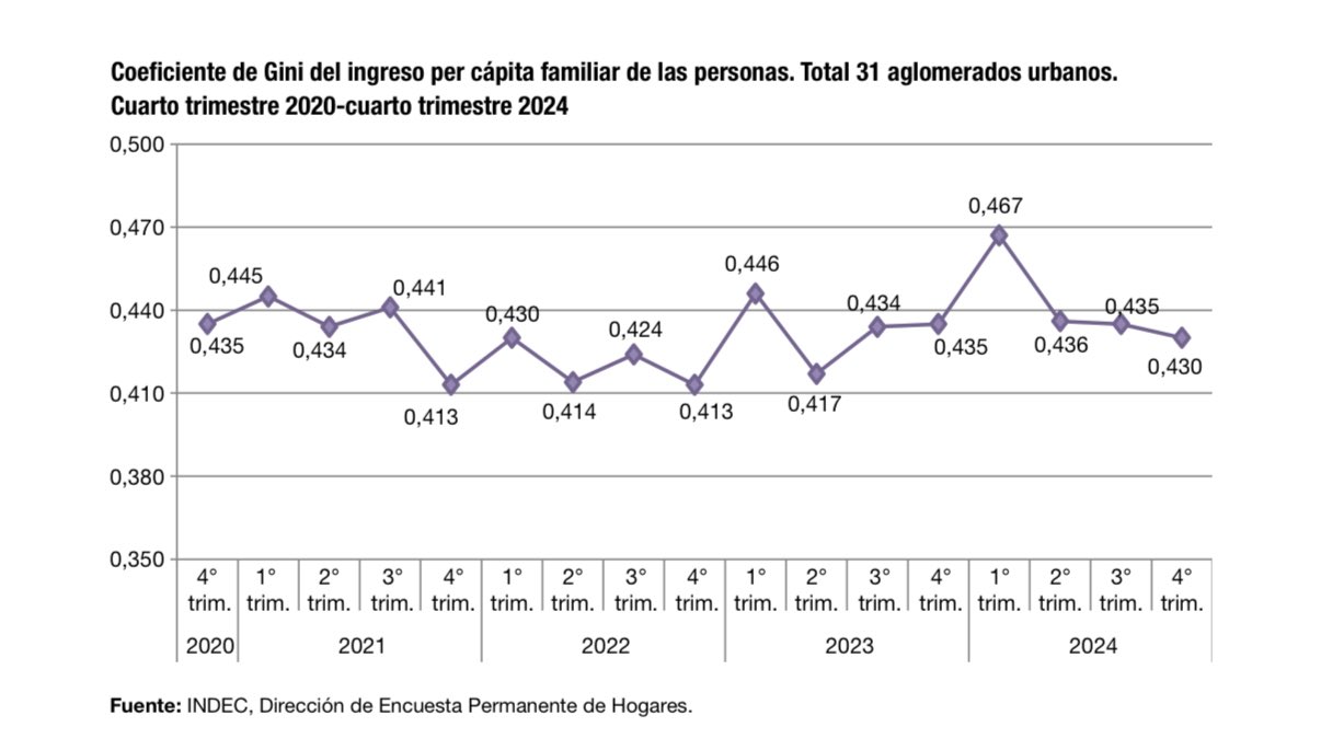 También la desigualdad parece haber caído por debajo de los niveles del tercer trimestre de 2023, cuando aún gobernaba Alberto Fernández, tal y como podemos ver en este gráfico: