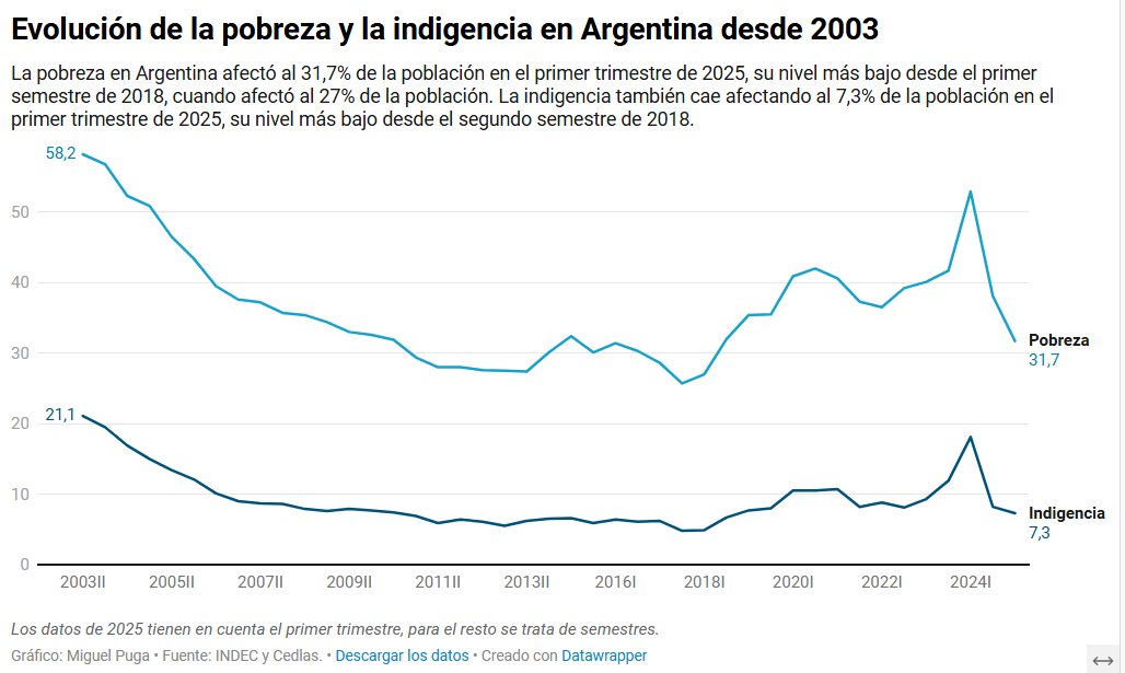 En el gráfico de arriba podemos ver la evolución tanto de la pobreza como de la indigencia desde el año 2003 hasta el primer trimestre de 2025. Como vemos, la pobreza en Argentina ha caído a su nivel más bajo desde el primer semestre de 2018, cuando afectó al 27% de la población (afecta ahora al 31,7%), mientras que la indigencia ha caído a su nivel más bajo desde el segundo semestre de 2018, afectando ahora al 7,3% de la población. Tal y como vemos, con el anterior gobierno de Alberto Fernández la pobreza nunca había sido tan baja.
