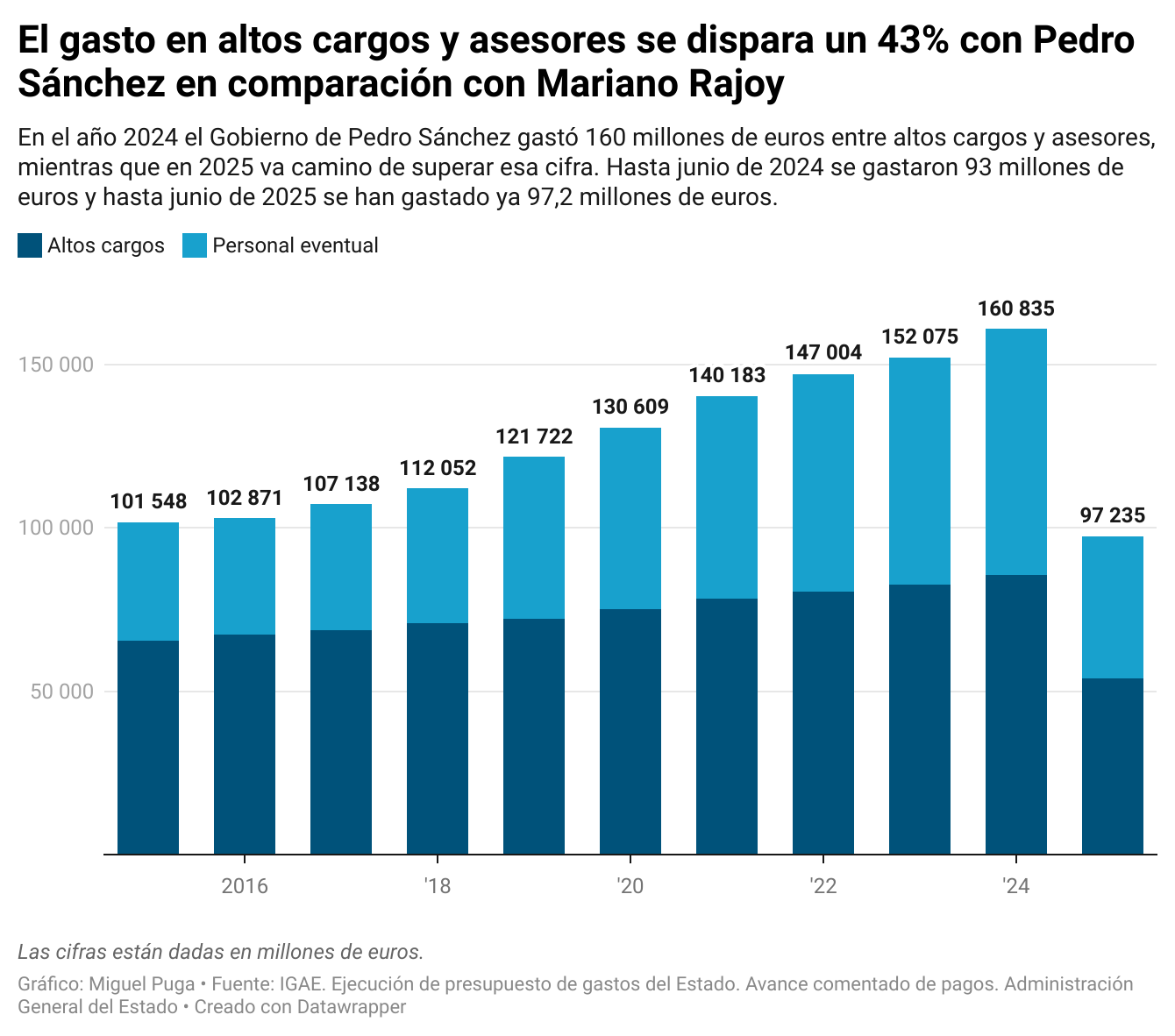 En el año 2024, el Gobierno de Sánchez gastó algo más de 160 millones de euros entre altos cargos y personal eventual, también conocidos como asesores. Estas cifras suponen un récord desde el año 2015 y suponen un 43% más que el gasto que hubo en el último año de gobierno de Mariano Rajoy, cuando se gastó en torno a 112 millones de euros (según el IGAE).