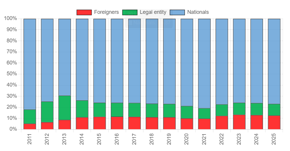 Como se puede observar en el gráfico, en el año 2011 el 82% de las viviendas que se compraron fueron adquiridas por compradores nacionales, mientras que un 5,2% fueron compradas por extranjeros y un 12,8 por personas jurídicas. En 2025, el 76,9% de las viviendas en compraventa fueron adquiridas por nacionales, el 12,6% por compradores extranjeros y el 10,5% por personas jurídicas. Vemos como el peso de los compradores extranjeros cada vez es mayor, mientras que el de las personas jurídicas es uno de los más bajos desde 2011.