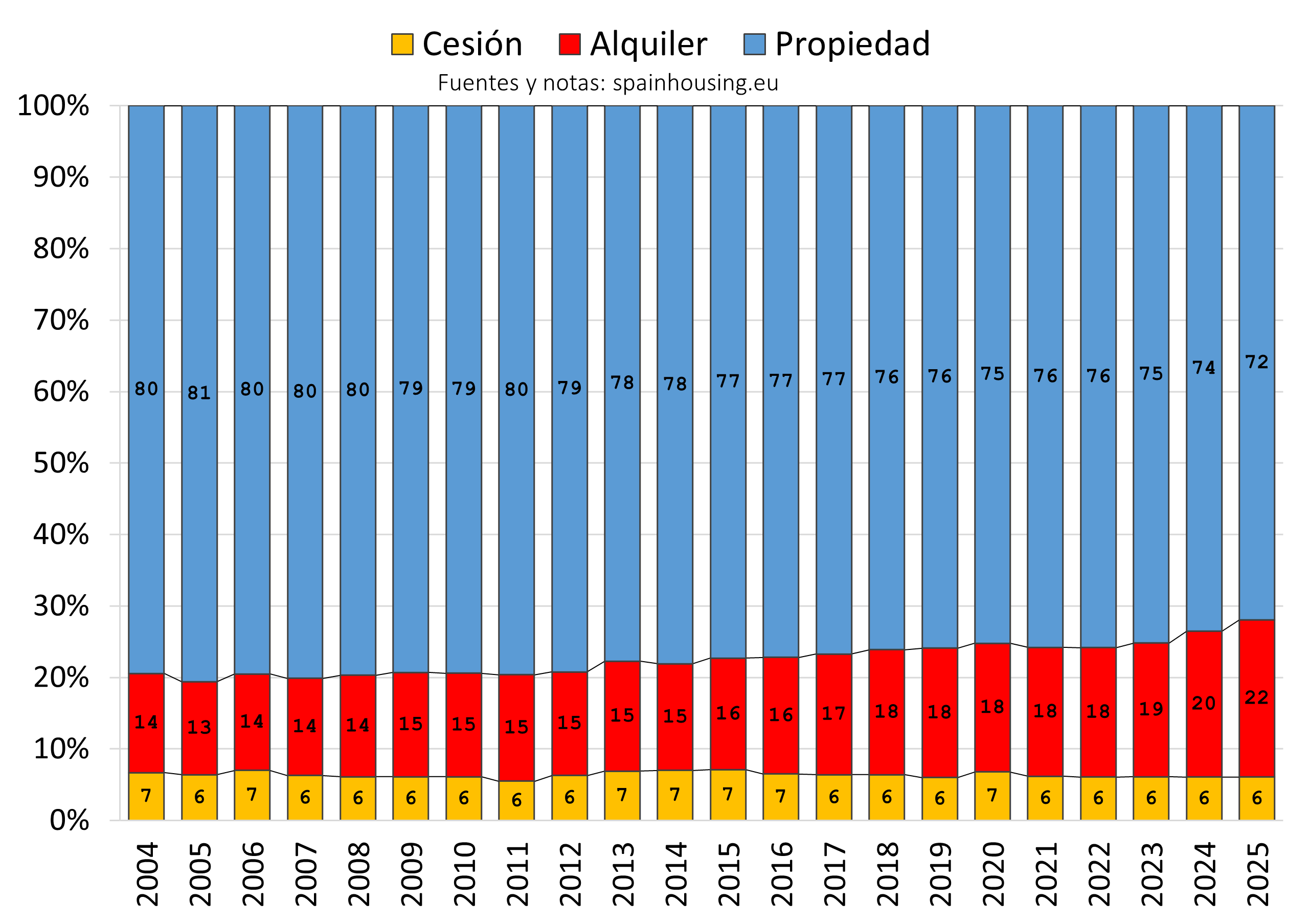 Tal y como se puede ver, en el año 2005 se alcanzó el máximo histórico de hogares residiendo en una vivienda en propiedad, cifra que año a año empezó a decaer hasta situarse en el 72% actual. Es decir, ya sólo el 72% de los hogares residen en una vivienda en propiedad. Por el contrario, el alquiler cada vez ha ido ganando un mayor peso, pasando de representar el 13% del total a ser del 22%. Como vemos, España parece estar pasando de ser "un país de propietarios" a "un país de proletarios", algo que parecía que se había superado hace años.
