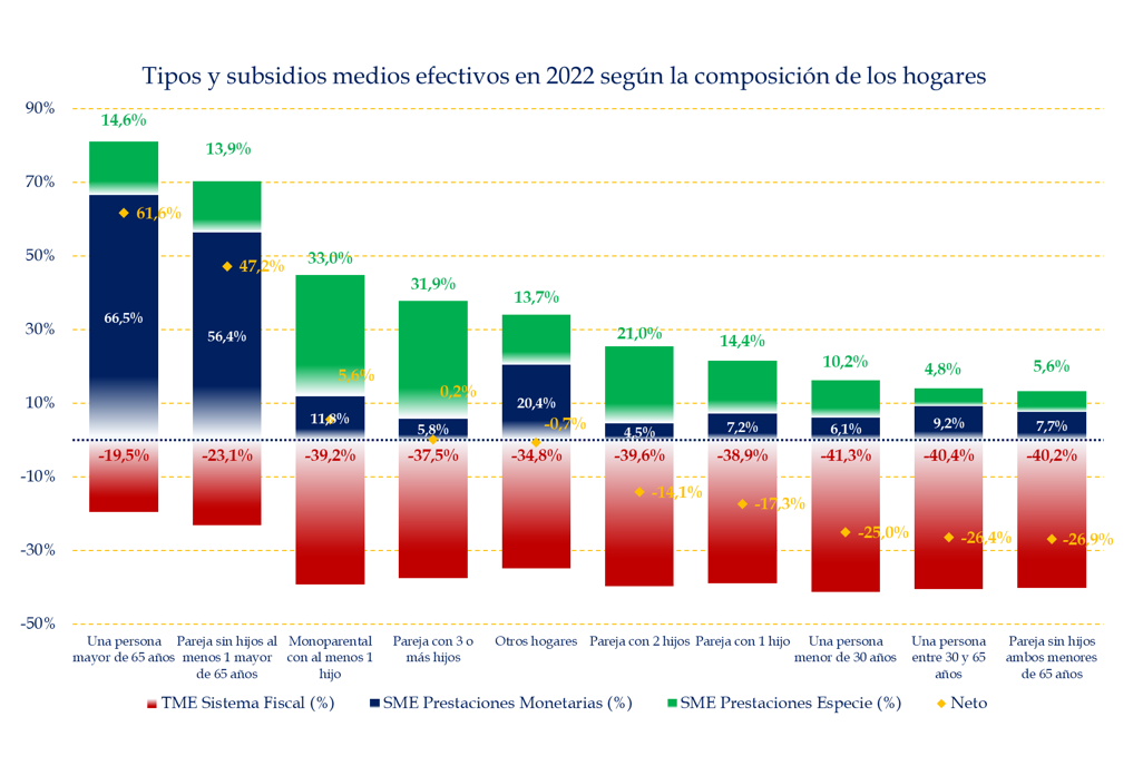 Por ejemplo, los pensionistas reciben mucho más de lo que aportan. Pero quizá sea un derecho adquirido por los años de cotización. En cualquier caso, o eres pensionista, o ya sabes que te va a tocar apoquinar más de lo que recibes de vuelta. Y, en la mayor parte de los casos, la diferencia no es pequeña. Por ejemplo, una típica pareja con un hijo tiene un balance negativo del 17,3% (los datos son de 2022, con las subidas de estos 3 años, la situación es algo peor). Y un soltero o una pareja sin hijos, tiene un saldo negativo de más del 26%.