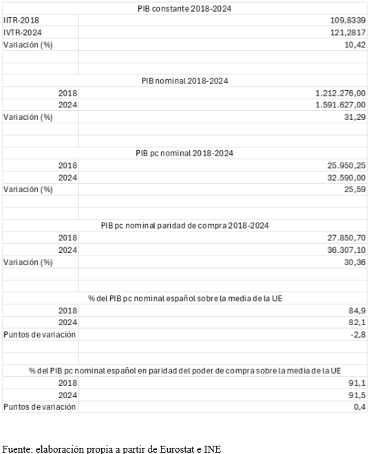 Además, perdemos posiciones en la UE respecto a la media del PIB pc nominal español sobre la media de la UE, retrocediendo 2,8 puntos entre 2018 y 2024, diferencia sólo atenuada con la revisión extraordinaria del PIB.