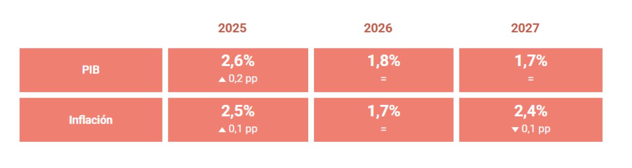 Así, la institución que dirige el exministro de Seguridad Social ha publicado recientemente su informe Proyecciones macroeconómicas e informe trimestral de la economía española, en el que detalla que este año el PIB crecerá un 2,6%. Además, espera que para 2026 el crecimiento del PIB será del 1,8% y, para 2027, este incremento será del 1,7%. Asimismo, la inflación crecerá un 2,5% este año, un 1,7% el próximo año y un 2,4% en 2027.