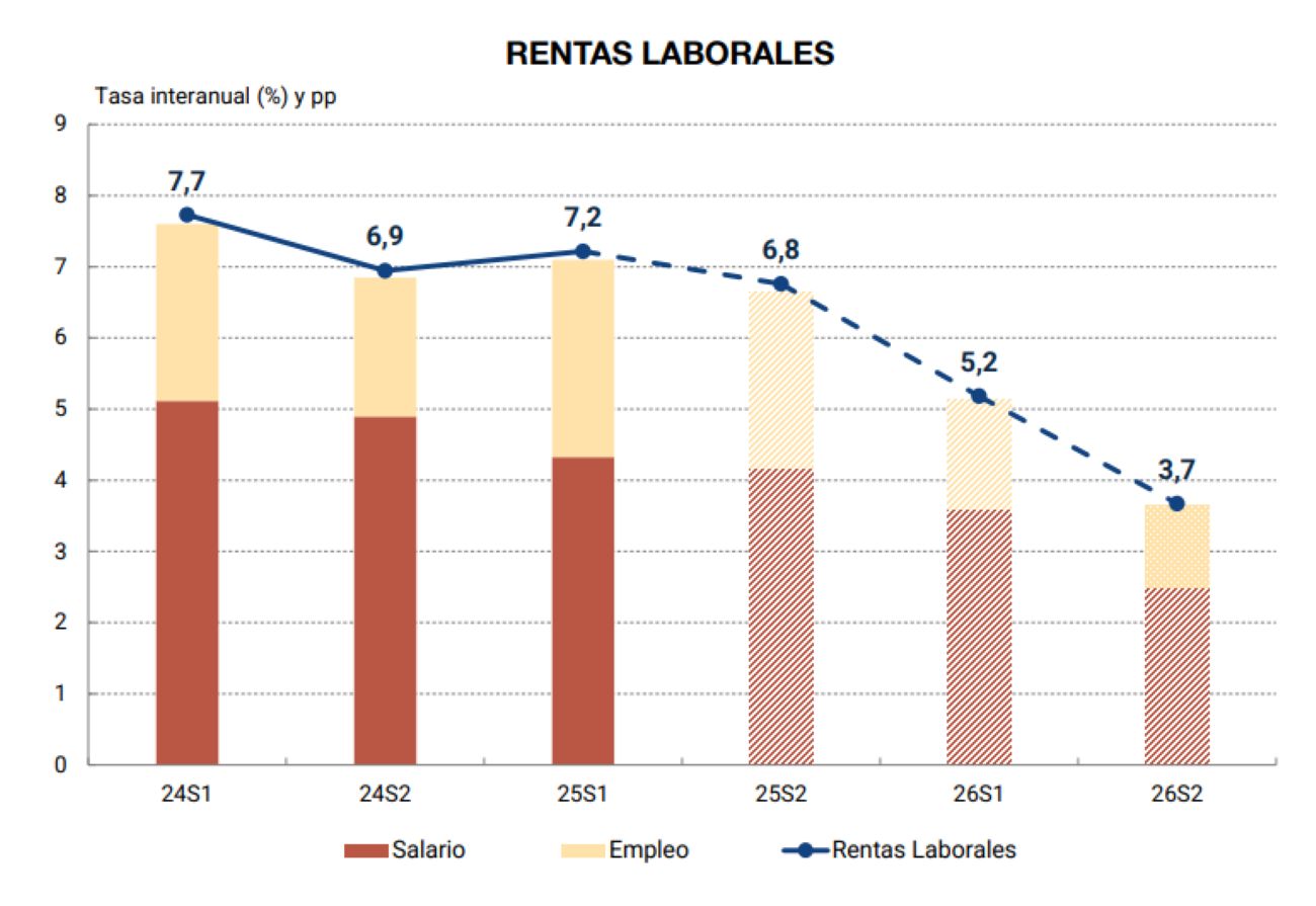 Al mismo tiempo, el Banco de España destaca que otros indicadores económicos también se van a enfriar los próximos años. En concreto, la institución anticipa que en los próximos ejercicios "la tasa de ahorro continuará reduciéndose". Además, detalla que "las rentas laborales continuarán su crecimiento a un ritmo más moderado", creciendo cada vez a un ritmo menor.