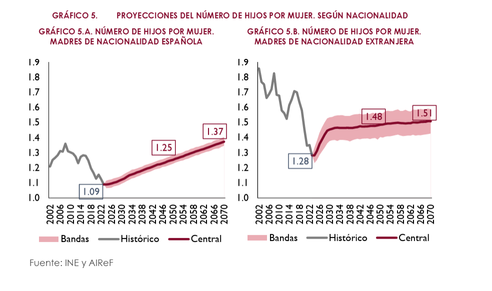 Como se puede ver en los gráficos, la actual tasa de natalidad de las mujeres españolas pasaría de situarse en los 1,09 hijos por mujer en la actualidad a los 1,25 hijos por mujer española en 2050, mientras que para el año 2070 se alcanzaría los 1,37 hijos en promedio por mujer española. En el caso de las mujeres extranjeras, la tasa actual de natalidad (1,28 hijos por mujer) se elevaría a los 1,48 hijos en promedio para 2050 y a los 1,51 hijos en promedio para 2070.