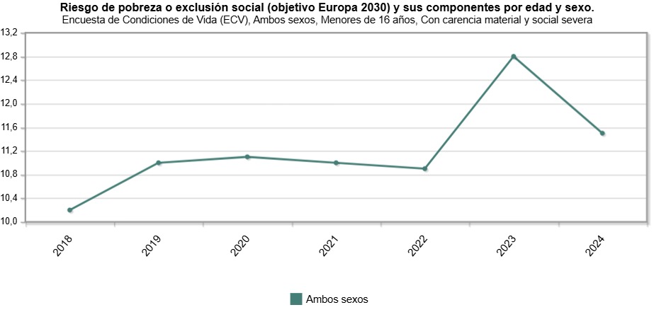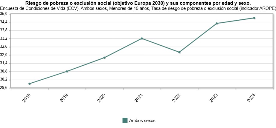 Sin embargo, la realidad es que el 34,7% de la población española menor de 16 años se encuentra en riesgo de pobreza o exclusión social, la cifra más alta de los últimos años. Cuando Pedro Sánchez llegó al Gobierno de España el 30,8% de los menores de 16 años estaban en situación de riesgo de pobreza o exclusión social, es decir, casi cuatro puntos inferiores a la actual tasa.