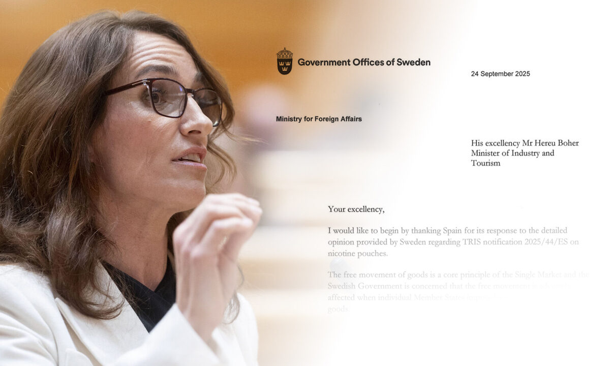 El choque entre Suecia y España por la regulación de las bolsitas de nicotina ha pasado de lo técnico a lo diplomático. El gobierno sueco ha enviado una carta oficial a Madrid en la que acusa a España de romper las reglas del mercado único con la disparatada propuesta de Mónica García: fijar en 0,99 miligramos el máximo de nicotina permitido por bolsita.