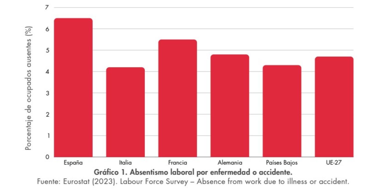 En este contexto, España se ha situado a la cabeza en Europa en términos de absentismo laboral. Al respecto, empleando los datos proporcionados por Eurostat, el informe destaca que en el año 2023, mientras en España cerca del 6,5% de los ocupados se ausentó de su puesto de trabajo, la media de la UE se situó en el 4,7%. Es decir, la media española supera casi en dos puntos la media europea. Así, esta proporción fue del 4,8% en Alemania, del 4,2% en Italia, del 4,3% en Países Bajos y del 5,5% en Francia.