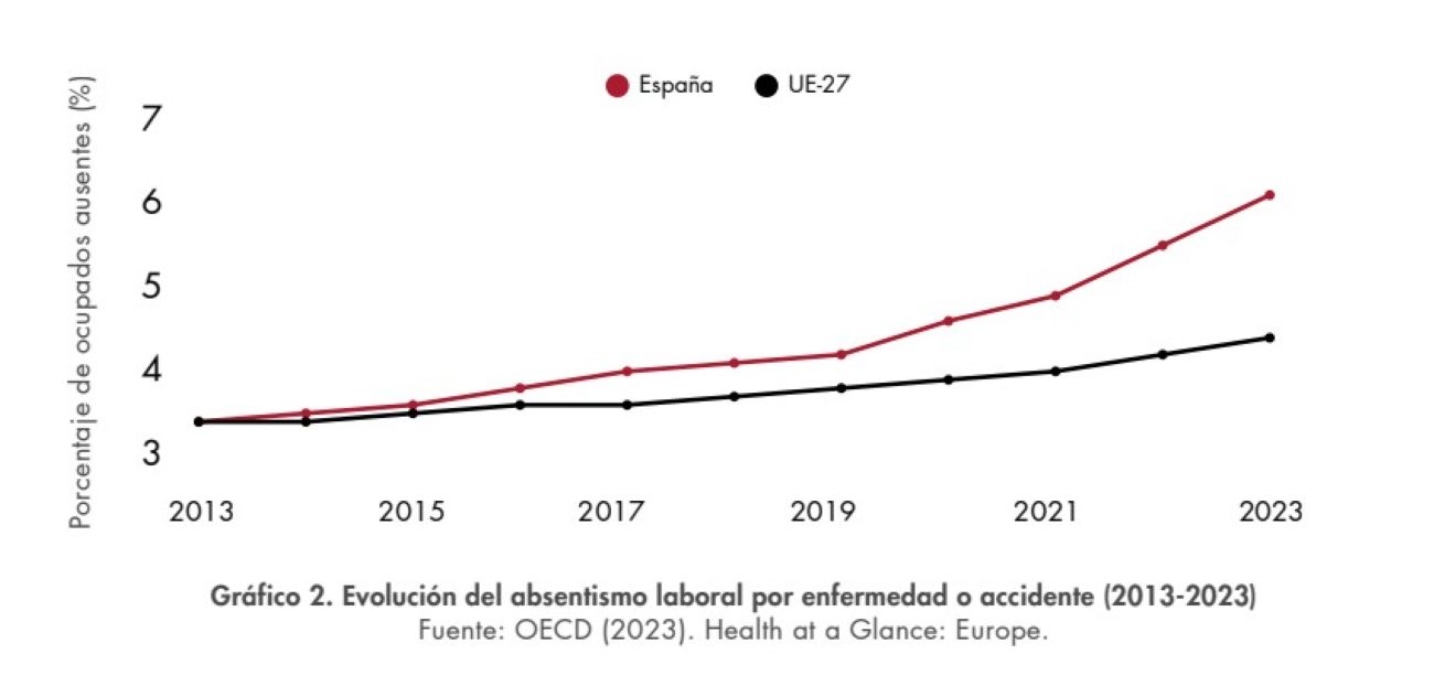 Así las cosas, Civismo concluye a este respecto que "este diferencial sugiere la existencia de factores estructurales internos, vinculados a la organización del sistema de incapacidad temporal, al perfil demográfico de la fuerza laboral y a la especialización sectorial", lo que se ve respaldado por la OCDE, en cuyo informe sobre salud y empleo detalla que "España figura entre los países con mayor duración media de los procesos de baja médica, lo que amplifica el número total de jornadas perdidas".