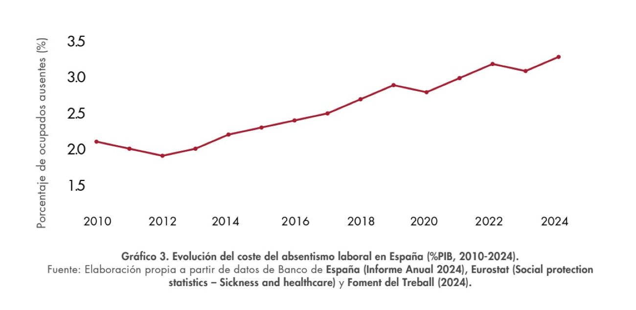 Esto es así en la medida en que el absentismo laboral no sólo afecta al mercado de trabajo, puesto que "afecta de forma directa a la productividad nacional, a la competitividad frente a otros países europeos y al equilibrio presupuestario del sistema público". Concretamente, según el informe de la Fundación Civismo, en términos macroeconómicos "el absentismo equivale a entre el 3% y el 3,5% del PIB anual", superando al porcentaje de gasto dedicado en universidad y en investigación y desarrollo.