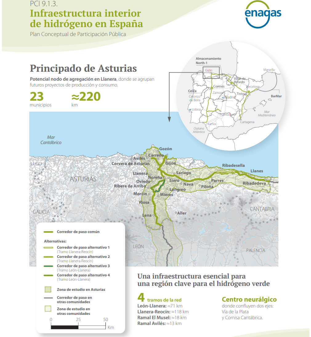 El Principado dispondrá de una red de alrededor de 220 km de hidroductos, como parte del Eje Vía de la Plata y del Eje de la Cornisa Cantábrica. En concreto, cuatro tramos de la red discurrirán por el Principado: León-Llanera, de alrededor de 71 km; Llanera-Reocín, con aproximadamente 118 km; Ramal El Musel, con unos 18 km, y Ramal Avilés, de en torno a 13 km.
