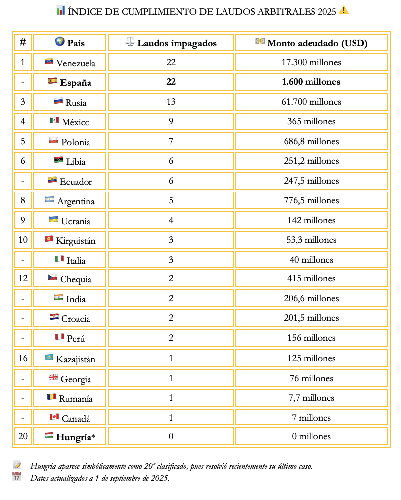 España se ha consolidado como uno de los países con peor historial en el cumplimiento de laudos arbitrales internacionales. Según el Índice de Cumplimiento de Laudos Arbitrales de 2025, elaborado un año más por el experto internacional Nikos Lavranos, nuestro país figura junto a Venezuela en lo más alto del ranking global de economías con más sentencias firmes pendientes de pago.