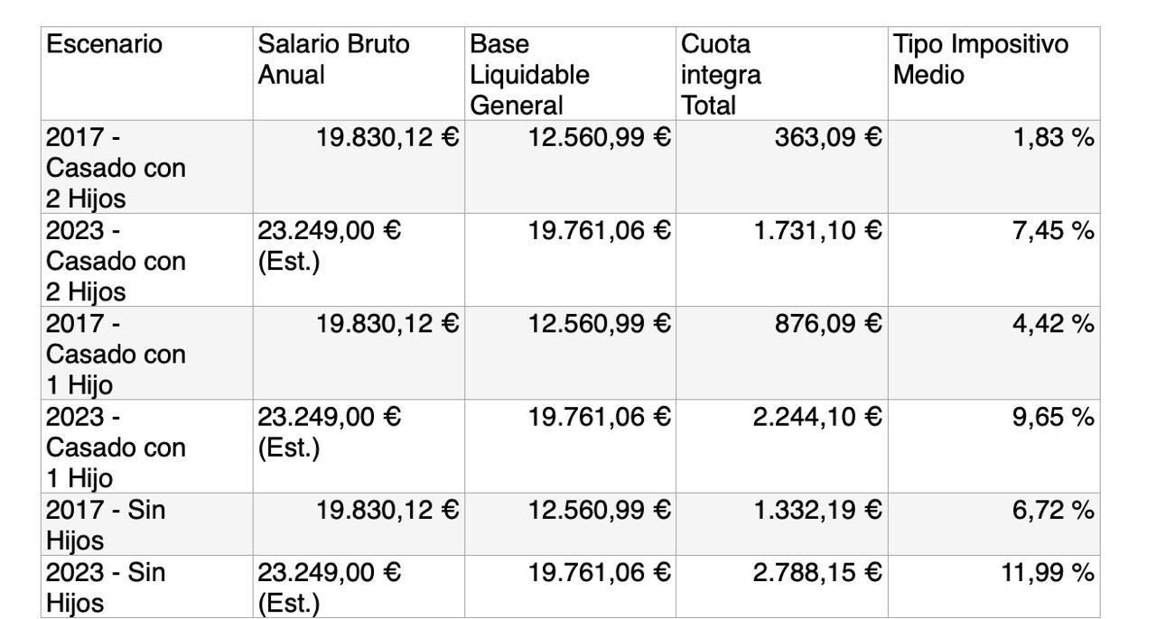 Pues bien, para ver aún más claro el efecto, se ha calculado para una persona casada con dos hijos, con un hijo, o para una persona que viva sola.