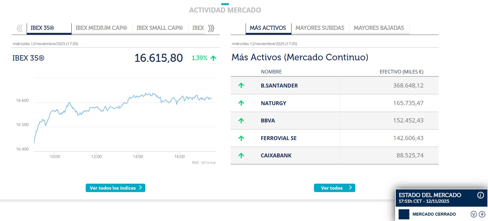 El principal indicador bursátil de nuestro país, el Ibex 35, sigue al alza y marca un nuevo máximo histórico, superando los 16.600 puntos. De este modo, pocos días después de que se llegara a un acuerdo en el Senado de EEUU con el fin de poner fin al cierre del Gobierno federal, al cierre de la sesión de este miércoles, el indicativo lograba situarse en los 16.615,80 puntos, ganando un 1,39%.