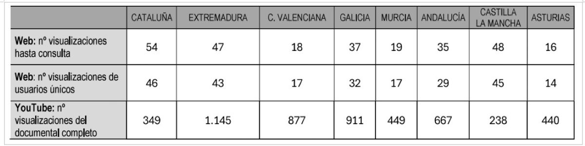 Los libros asociados a estas producciones audiovisuales registran cifras de acceso digital entre 54 y 14 visualizaciones únicas. En cuanto a los documentales, el producido en Extremadura lidera el ranking con 1.145 reproducciones completas en YouTube, el gallego acumula 911, seguido por el gallego con 911, valenciano con 877. El andaluz alcanza 667, mientras que el murciano se queda en 449; el asturiano, 440; el catalán 349 y por último, el manchego con 238. Estas estadísticas, extraídas de la resolución, muestran un interés escaso por parte de los españoles.