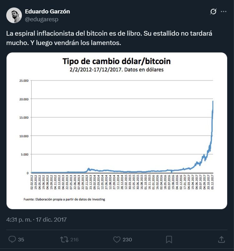 De la misma forma que ya hizo en su día Gonzalo Bernardos, Eduardo también ha afirmado en numerosas ocasiones que Bitcoin es una burbuja y que está estallando de forma permanente. En el año 2017 escribió un tuit donde hablaba de una "espiral inflacionista" en torno al Bitcoin y avisó de que "su estallido no tardaría mucho" en llegar.
