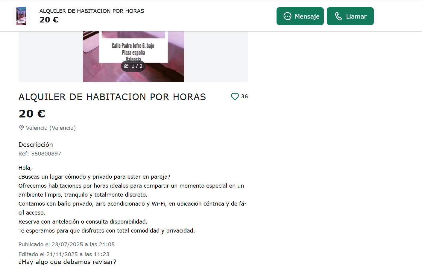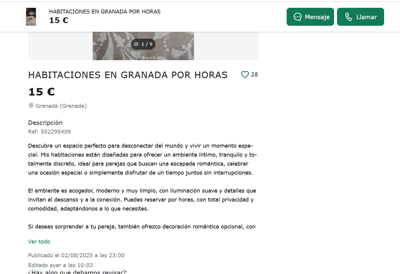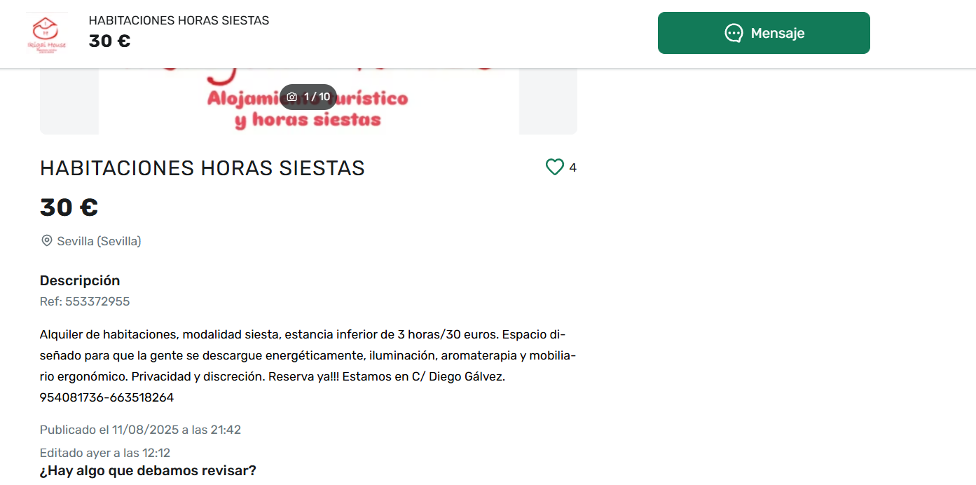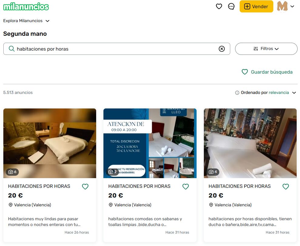 Si realizamos una búsqueda en esta plataforma, podremos encontrar más de 5.500 anuncios donde se ofrece el alquiler por horas de una habitación desde un precio de unos 10 euros en adelante, dependiendo de la ciudad donde se encuentre y de las características que tenga la vivienda. En su gran mayoría, estas habitaciones se ofrecen para que las parejas puedan pasar unas horas de intimidad y soledad.