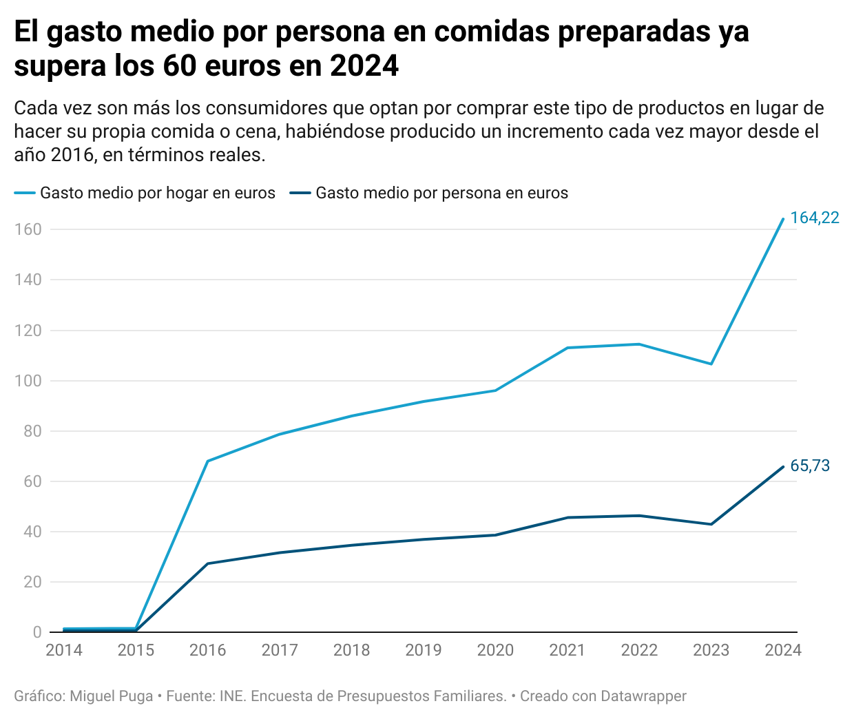 Según los datos proporcionados por el Instituto Nacional de Estadística (INE), de esta forma ha evolucionado el gasto medio por hogar y por persona en "comidas preparadas" en los últimos 10 años disponibles, desde 2014 hasta 2024: