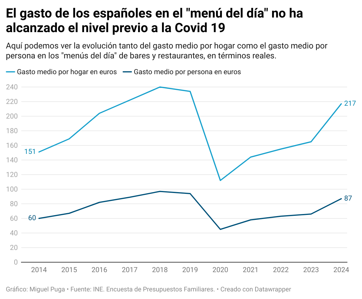 Tal y como se puede ver en el gráfico, el pico de gasto desde el 2014 en menús del día se alcanzó en el año 2018, cuando los hogares españoles gastaron una media de 240 euros al año en este servicio, al tiempo que el gasto medio por persona fue de 97 euros.