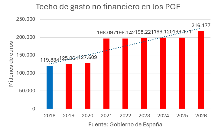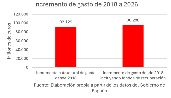 Así, si se suman los fondos europeos, el techo de gasto no financiero se eleva hasta 216.177 millones, es decir, 395,67 millones de euros sobre el actual. Esto muestra claramente que cada vez se está consolidando más gasto estructural, ya que el gasto no financiero sin fondos europeos crece en más de 16.000 millones mientras que el que contiene fondos sólo 396 millones, de manera que si antes había millones de diferencia, ahora hay 4.000 millones, que certifica el carácter estructural que adopta dicho gasto.