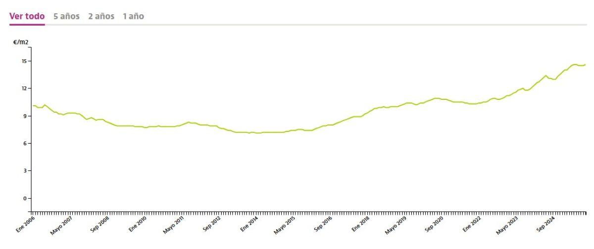 Llevamos años instalados en este bucle, pero el resultado es el que es: los precios están por las nubes y el problema se agrava. Lo vemos, por ejemplo, en el siguiente gráfico del portal Idealista que, con datos del Ministerio de Transporte, muestra la evolución de los visados de vivienda de obra nueva entre 1991 y 2025. Como puede verse, los niveles de construcción han sido ínfimos desde el estallido de la burbuja inmobiliaria y, si bien el ajuste inicial tenía sentido tras años de excesos, los datos de la última década han seguido en niveles tan reducidos que el resultado, como no podía ser de otra forma, ha sido un repunte lento, pero sostenido e imparable, de los precios inmobiliarios, tanto en la compra-venta como en el arriendo.