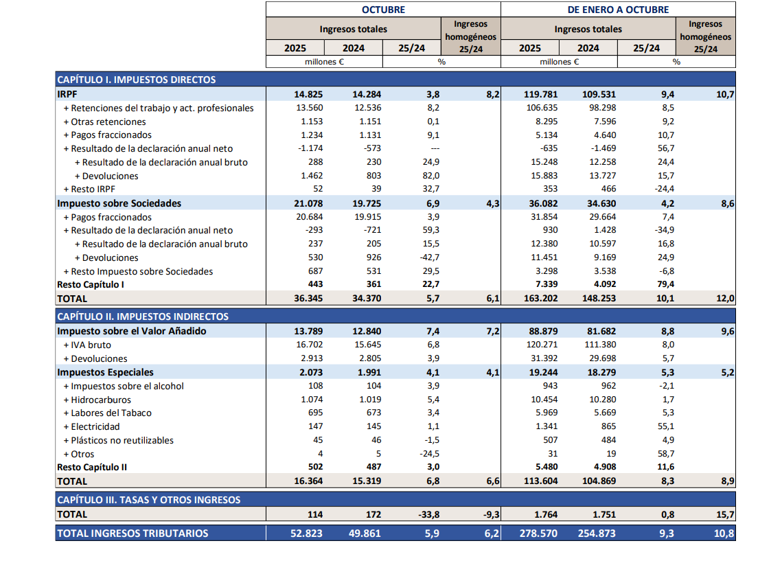 Como es habitual, el IRPF volvió a ser el impuesto por el que más recauda Hacienda. En concreto, hasta octubre, el departamento de María Jesús Montero ingresó 119.781 millones de euros por este tributo, 10.000 millones más que un año antes, por lo que el IRPF es el causante de casi la mitad de la subida de la recaudación.