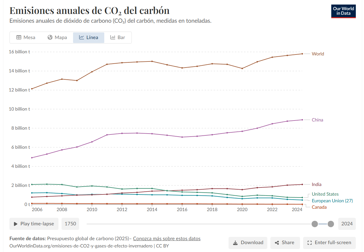 En el siguiente gráfico de Our World In Data podemos ver la evolución de las emisiones anuales de CO2 del carbón hasta 2024: