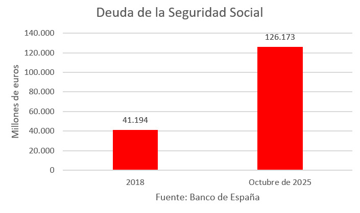 Y esa deuda, Sánchez la eleva en alrededor de 85.000 millones de euros desde que gobierna. Los datos del último mes disponible no hacen sino confirmar este desfondamiento: así, pasamos de una deuda de la Seguridad Social de 41.194 millones en 2018 a otra de 126.173 millones en el último dato publicado, octubre de 2025.