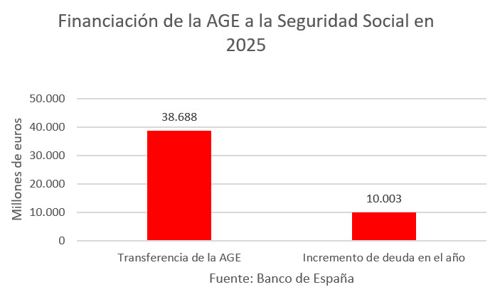 ¿Esto qué quiere decir? Que la AGE asume esos 2,5 puntos de déficit sobre el PIB, pasando a ser mayor déficit de la AGE y menor déficit de la Seguridad Social. Desde el punto de vista del déficit del Reino de España es neutro, porque se cambia de administración el déficit, pero sigue siendo el mismo. Ahora, eso maquilla el déficit de la Seguridad Social. Sin ello, su déficit sería de esa cuantía superior. Por otra parte, si aun así no equilibra su balance, la Seguridad Social recibirá un préstamo de la AGE, aparte de su incremento de endeudamiento en 2025, que no deja de emitirlo el Tesoro.