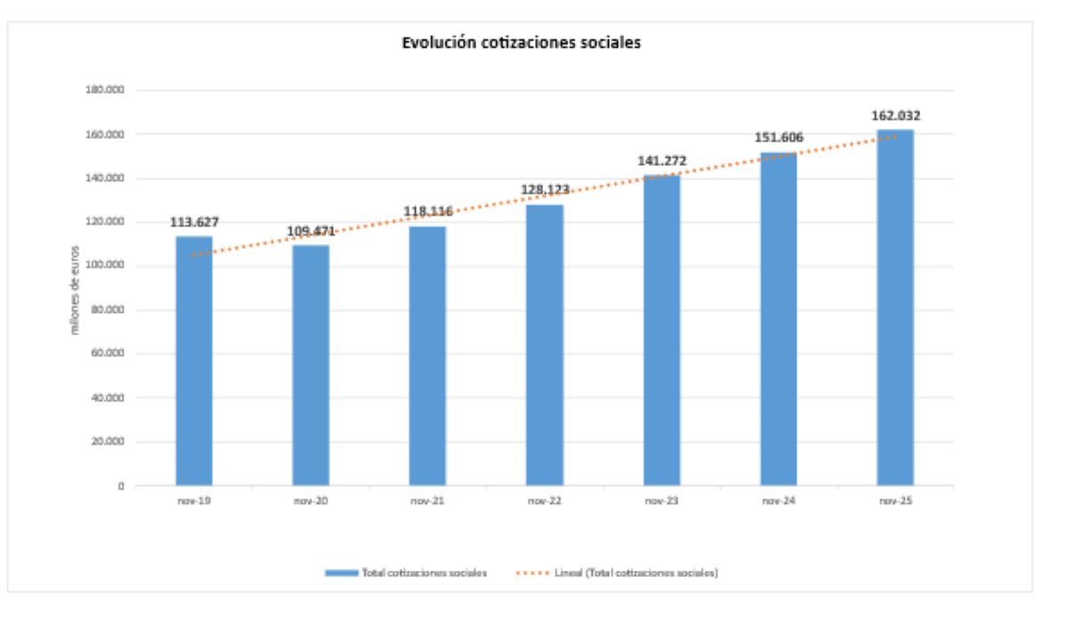 Con todo, desde el Ministerio que dirige Elma Saiz se felicitan de que, hasta el mes de noviembre, los ingresos por cotizaciones a la Seguridad Social han alcanzado los 162.032 millones de euros, registrando un incremento del 6,9% en tasa anual. Del mismo modo, destacan que los ingresos derivados del MEI han alcanzado los 4.506 millones de euros, con un aumento del 32,7% en comparación con el año anterior.