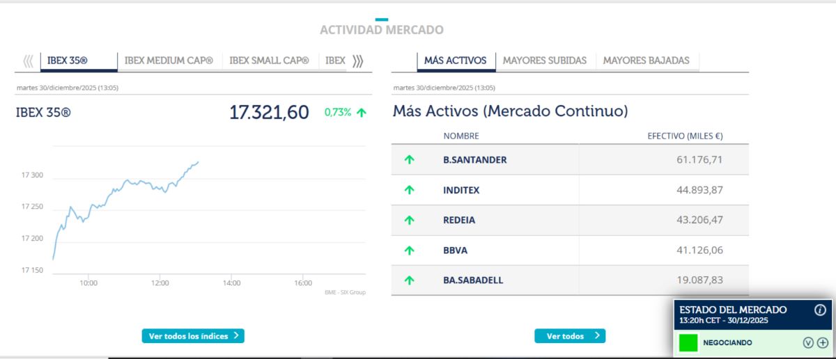Por tanto, a sólo un día de cerrar el ejercicio de 2025, el selectivo cotiza en nuevos máximos históricos y acumula una revaloración de casi el 50% en lo que va de año. Asimismo, durante el mes de diciembre, la revalorización del Ibex es, hasta el momento, del 5,6%. Con todo, cabe recordar que, si bien la sesión de este 30 de diciembre se desarrollará con normalidad, mañana solo habrá una sesión parcial y el 1 de enero los mercados permanecerán cerrados.