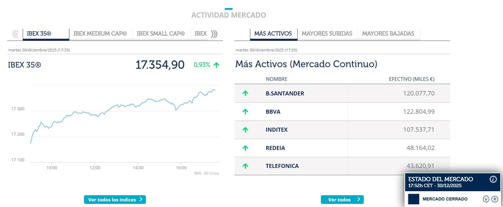 El Ibex 35, principal indicador bursátil de nuestro país, encara el final del año marcando nuevos máximos históricos. Concretamente, en una sesión marcada por la publicación del dato adelantado del IPC en España y de las actas de la Fed en EEUU, el indicativo ha cerrado la jornada con una subida del 0,93%, por el avance de la banca, los grandes valores y las plazas europeas, situándose en los 17.354,9 puntos.