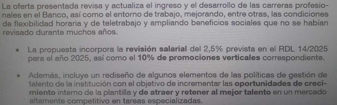 En su propuesta en la mesa de negociación la enumeración de beneficios a los trabajadores es infinita. Dentro de su Plan Estratégico 2030 la Dirección del Banco pretende impulsar un convenio que fomente "la flexibilidad, la formación continua y la carrera profesional para abordar los retos presentes y futuros" redacta. Para a continuación hablar de la importancia de que todos puedan desempeñar sus funciones "de forma más ágil y potenciar el bienestar y los beneficios de todas y cada una de las personas de nuestra plantilla". Por no hablar de que uno de sus objetivos es "atraer y retener al mejor talento" al Banco.