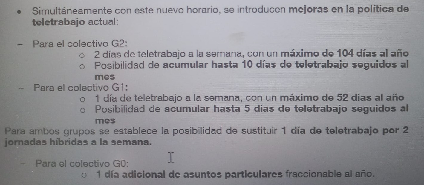De esta manera propone una revisión salarial del 2,5% para el 2025. La flexibilidad llega en forma de "mejoras en el horario" para poder entrar entre las 7 y las 10 de la mañana. Por la tarde los trabajadores podrán salir desde las 16.45 hasta las 20.00, y lo que trabajen por la mañana, a las 13.00, siendo de 10 a 13.00 obligatoria la permanencia. Además les dará más tiempo para comer. "Había mucho malestar porque en veinte minutos no te daba tiempo a comer", aseguran. Ahora suben el tiempo de comida hasta la media hora.