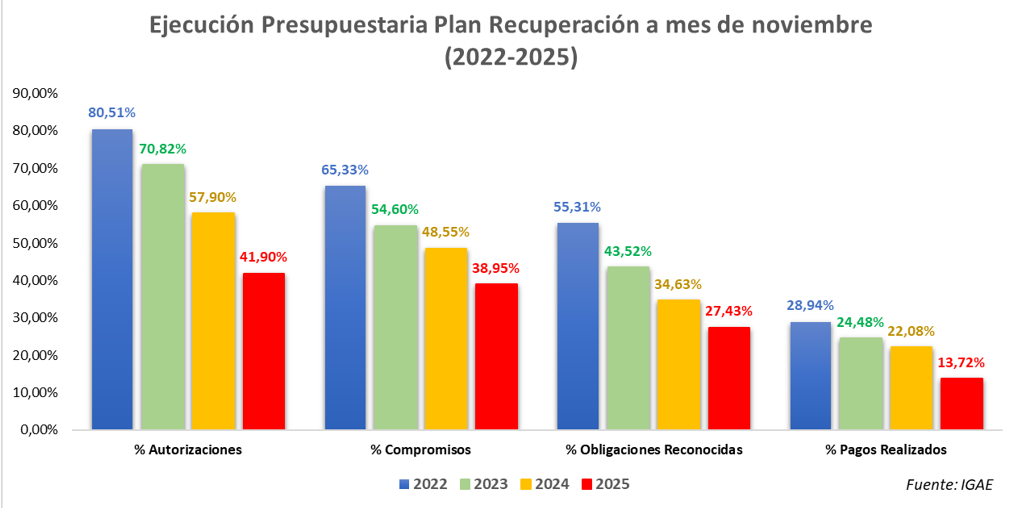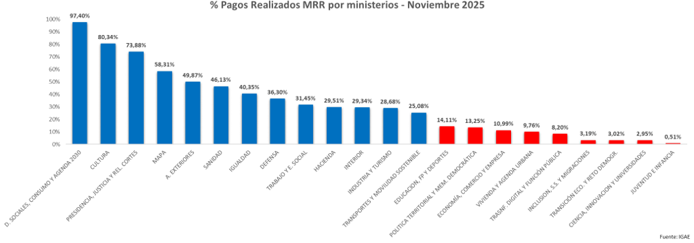 Con los últimos datos recién publicados por la IGAE hasta final de noviembre, los pagos realizados este año ascienden a 4.739 M€, un 13,72% de los créditos definitivos para 2025. Es el peor ejercicio, tanto en términos relativos, como absolutos. Un auténtico fiasco.