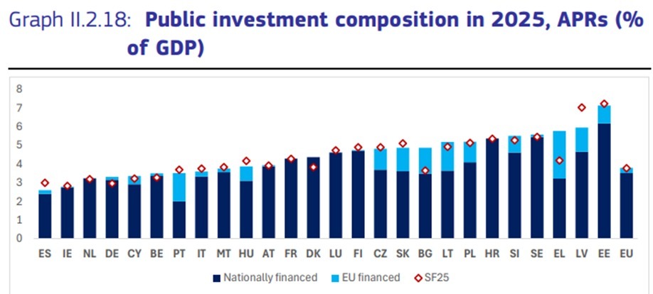 Cinco años después, estos fondos europeos se traducen en productividad por ocupado aún por debajo de 2018 (-0,9%), inversión privada real por debajo de 2019 (-5,4%), la FBCF estancada desde 2019 en el 20,3% del PIB y la inversión pública más baja de Europa en 2025. El objetivo era una transformación productiva, pero el resultado ha sido un gran programa de convocatorias que no cambian la estructura económica, no elevan la productividad y, por tanto, no permiten incrementar los salarios reales al alza de forma sostenible en el tiempo.