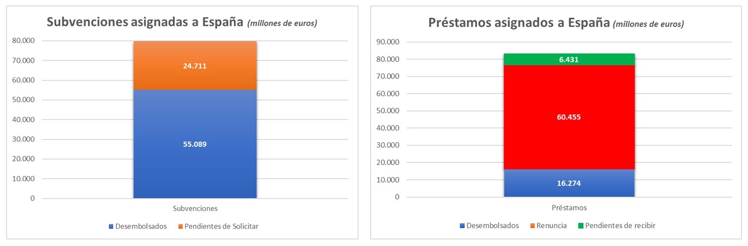 El gran fiasco de 2025 es el reconocimiento más revelador: la renuncia a buena parte de los préstamos. De 83.160 M€ en préstamos, se renuncia a 60.455 millones, quedándose en 22.705 M€ y renunciando a cerca del 75% de los créditos asignados a nuestro país.