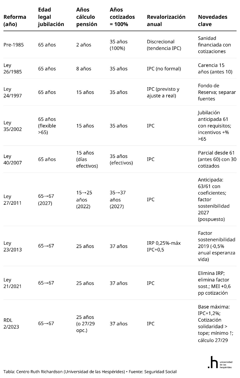 La siguiente tabla, elaborada por Santiago Calvo para un informe de la Universidad de las Hespérides, recoge estas ocho reformas introducidas desde 1985.