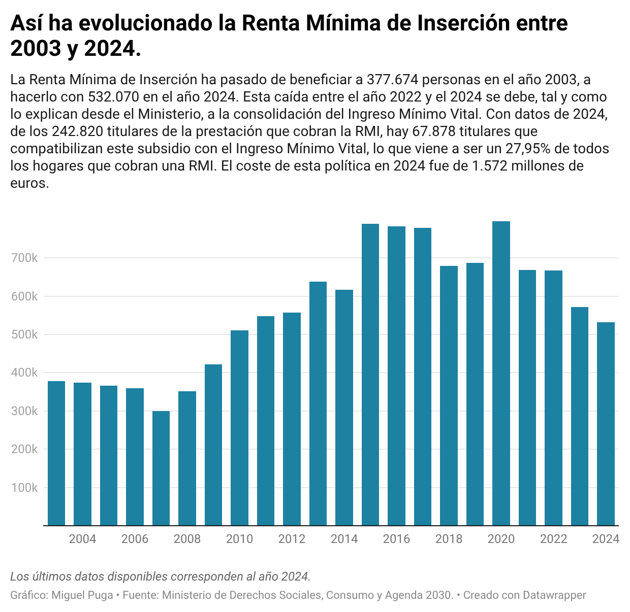 En primer lugar, tenemos que en el año 2024 el número de personas que se beneficiaron de cobrar una RMI fue de 532.070 en total.