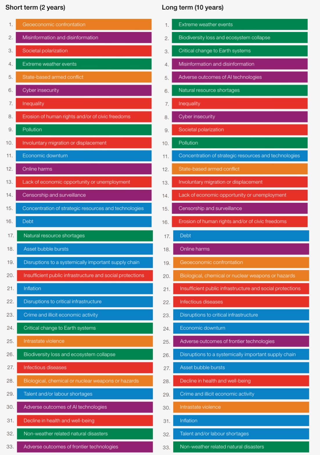 Como se puede ver en la tabla de arriba, entre los cinco mayores riesgos a los que se enfrenta el mundo a corto plazo (dos años) son: 1) confrontación geoeconómica, 2) la desinformación, 3) la polarización social, 4) los fenómenos meteorológicos extremos y 5) el conflicto armado estatal.