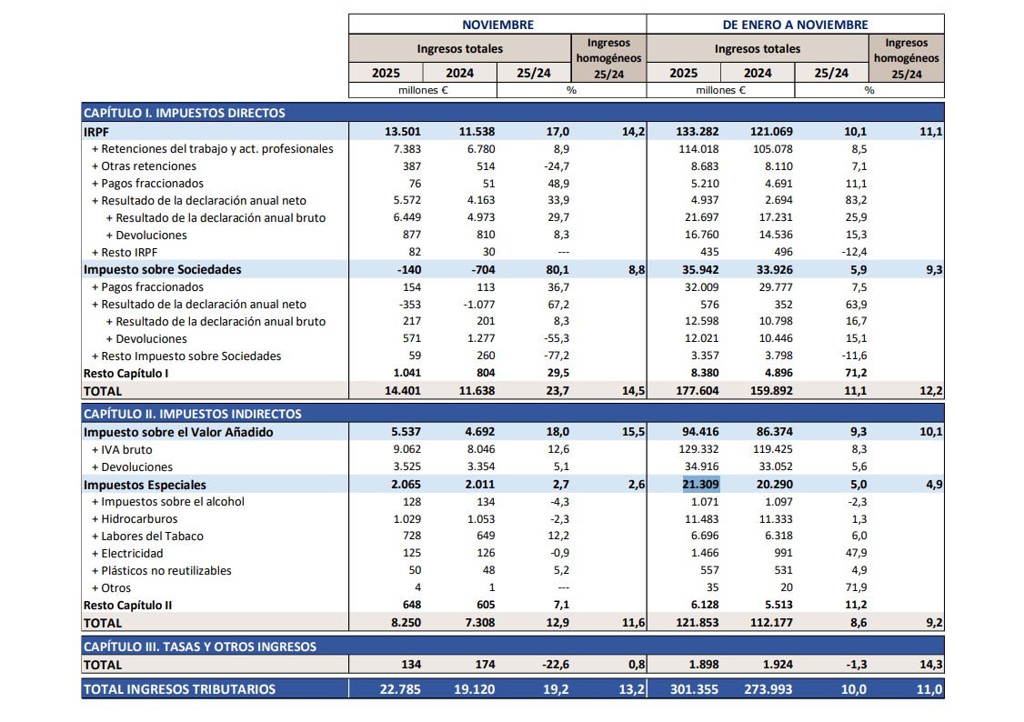 De este modo, el Fisco explica que en el mes de noviembre "se ingresaron, principalmente, los importes procedentes de las declaraciones mensuales habituales, el segundo plazo de las cuotas positivas de la declaración anual del IRPF, las declaraciones correspondientes al tercer trimestre de los impuestos sobre el alcohol, y el Impuesto sobre el Valor de la Producción de la Energía Eléctrica liquidando el tercer trimestre de los grandes productores y los tres primeros trimestres de los pequeños".