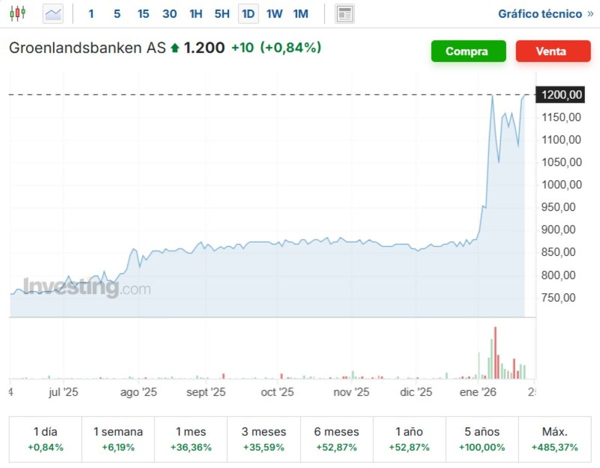 En este contexto, resulta especialmente curioso que, a pesar de las presiones de Donald Trump sobre Groenlandia, uno de los activos que están brillando en las últimas jornadas es, precisamente, el Groenlandsbanken, el único banco comercial de la isla, que cotiza en la bolsa de Copenhague. Concretamente, este banco se situaba este jueves en las 1.200 coronas danesas (unos 160,66 euros).