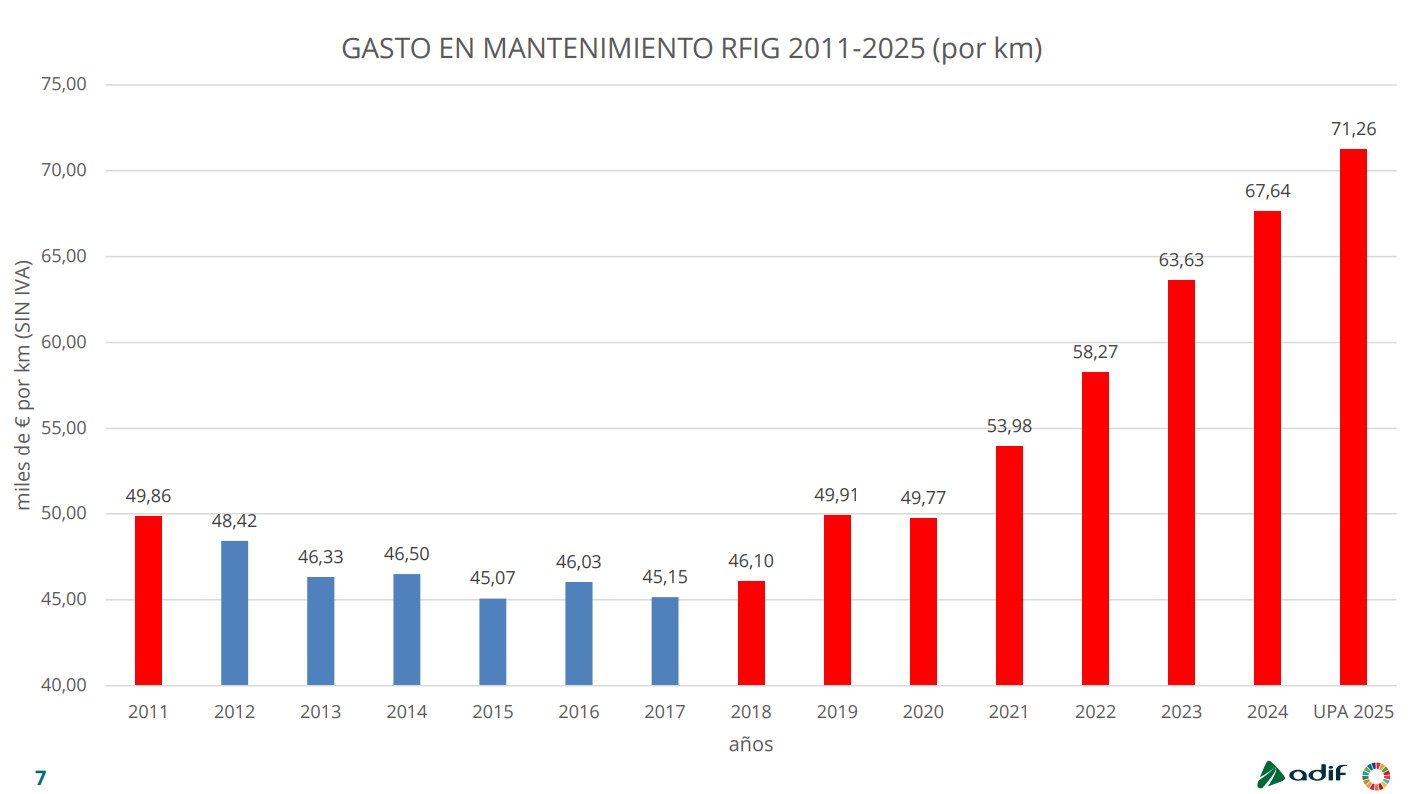 Asimismo, las cifras presentadas por el Ejecutivo sobre el gasto en mantenimiento en la infraestructura ferroviaria durante este mismo período, medidas sin IVA, señalaban que el gasto en mantenimiento del conjunto de la red ferroviaria se situó en los 726.496.000 euros en el año 2018, mientras que en 2025 ascendió hasta los 1.119.840.000 euros.