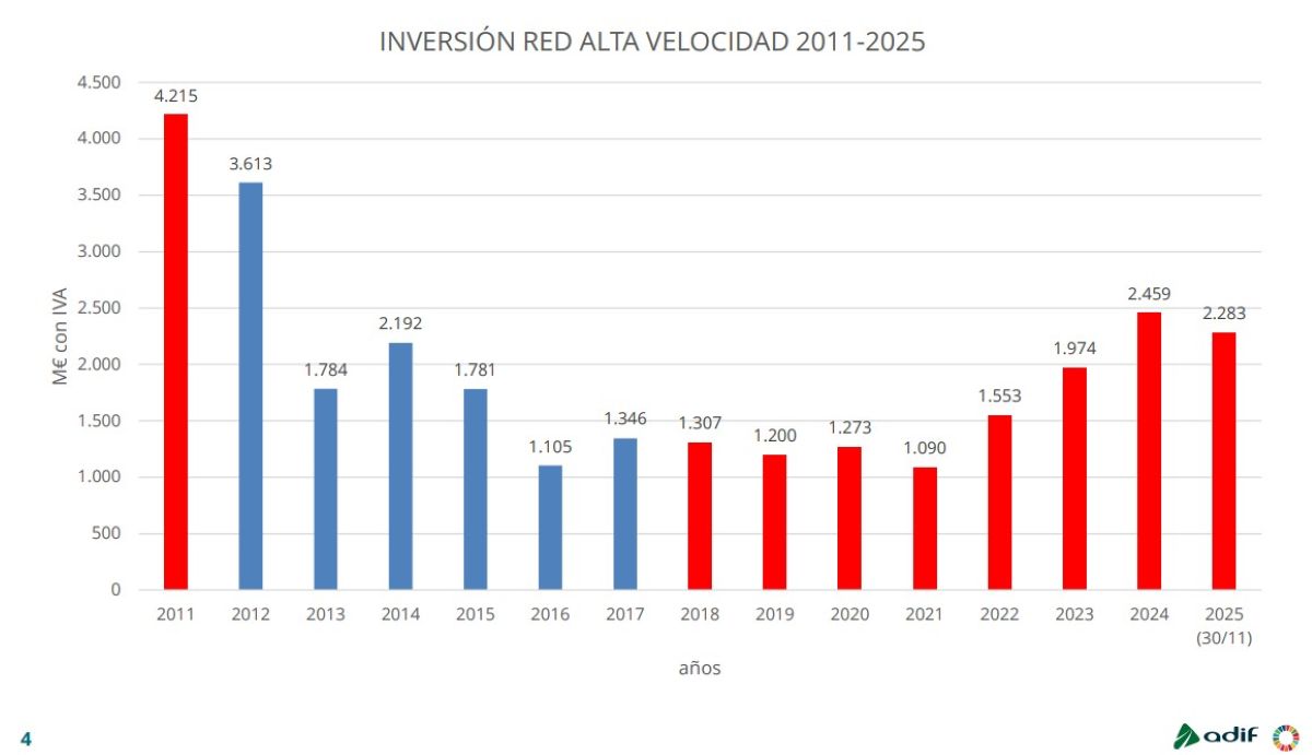Por otra parte, el documento presentado por el ministro de Transportes recogía que, si la inversión realizada en la red de alta velocidad en 2018 fue de 1.307 millones de euros, en el año 2025 alcanzó los 2.283 millones.