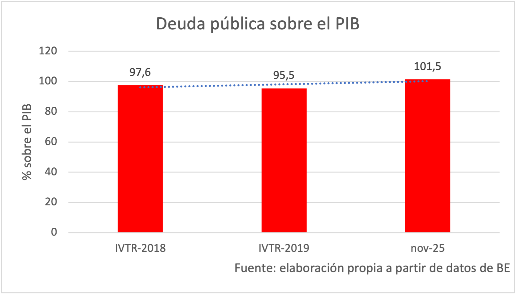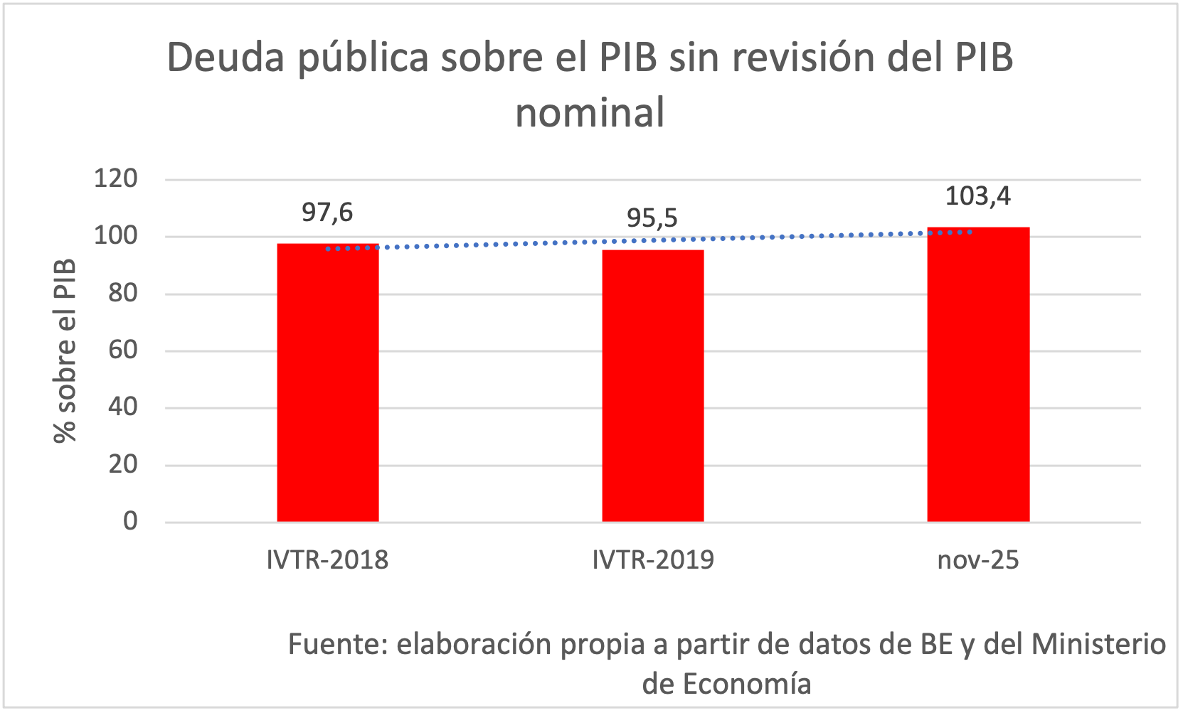 …sin esa revisión, sería del 103,4% del PIB. Es decir, la revisión extraordinaria del PIB rebaja en casi 2 puntos el cociente, pero la deuda sube con fuerza en valores absolutos: