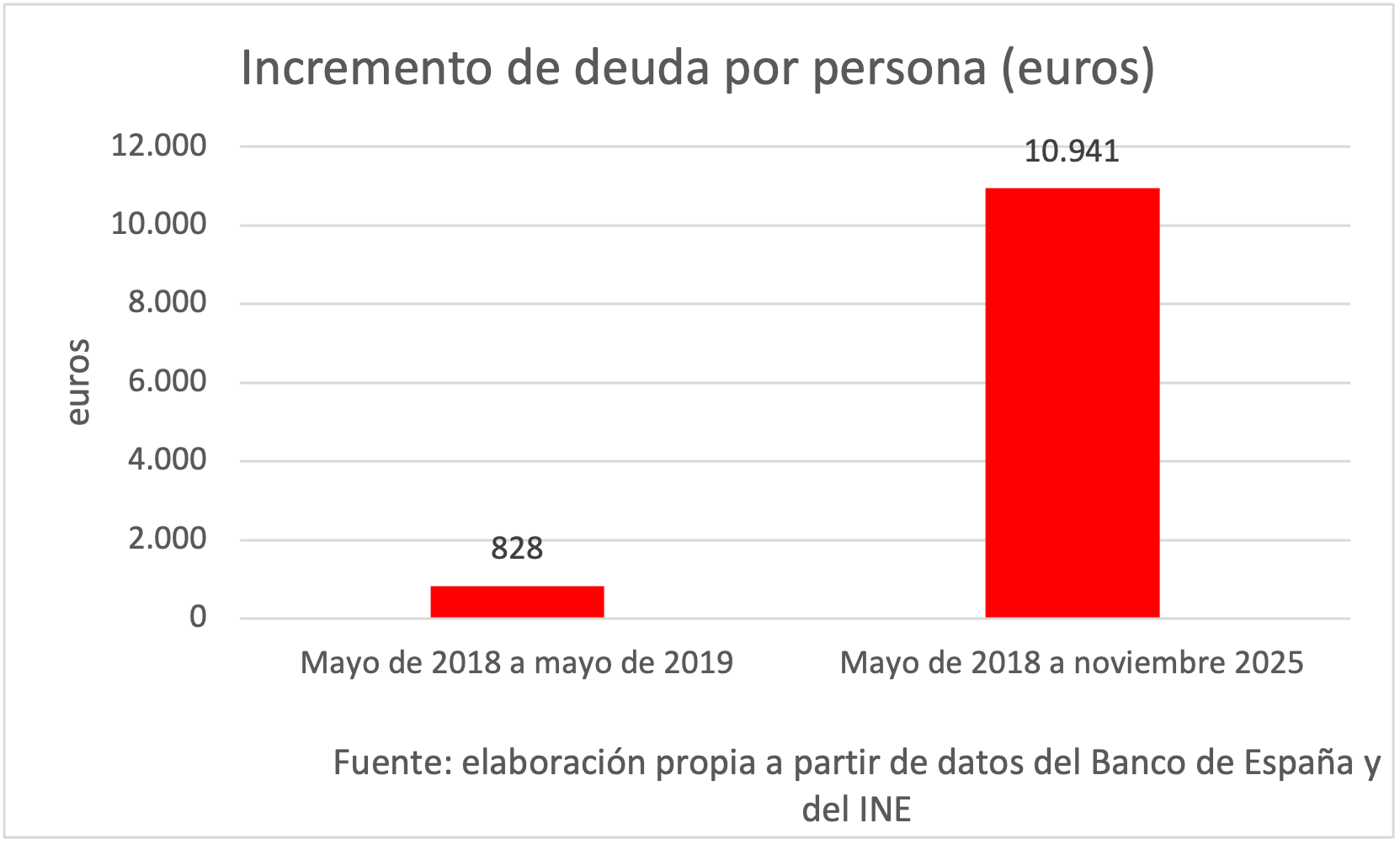 Así, si durante el primer año creció la deuda por persona en 828,03 euros, en los más de siete años y medio de mandato de Sánchez la deuda por persona ha aumentado en 10.838 euros (más de trece veces el incremento del primer año).