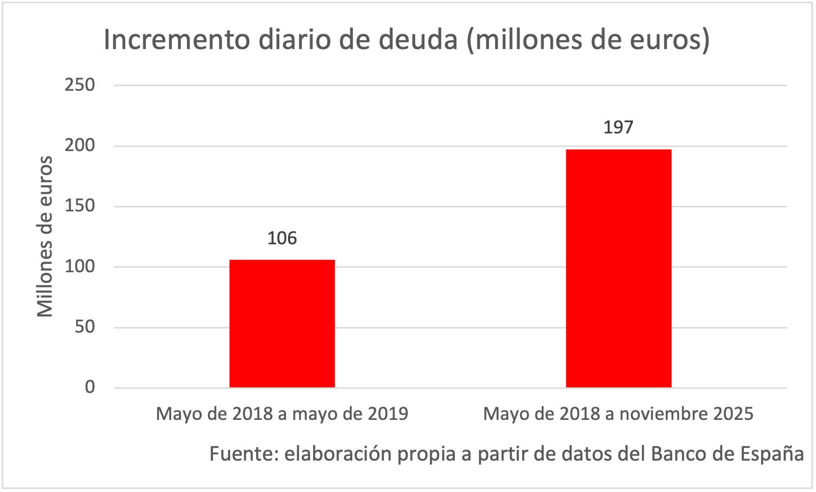 O visto de otra manera: en el primer año, la deuda se incrementaba a un ritmo de 105,99 millones de euros al día. Ahora, tras casi siete años de Gobierno de Sánchez, la deuda crece 197,42 millones de euros cada día.