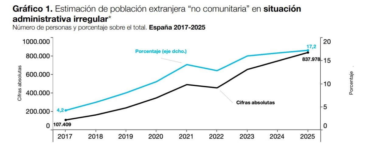 Asimismo, hemos detallado también que el número de inmigrantes ilegales se ha incrementado casi un 700% desde 2017. Si en el año 2017 en España había 107.000 inmigrantes irregulares, ahora esta cifra se sitúa en los 840.000 inmigrantes ilegales. Así se desprende de un informe publicado por Funcas en el que se detalla que los 840.000 ilegales representan el 17,2% de la población extranjera procedente de países no comunitarios. En cambio, en el año 2017, los inmigrantes irregulares suponían tan sólo el 4,2% del total de población extracomunitaria.
